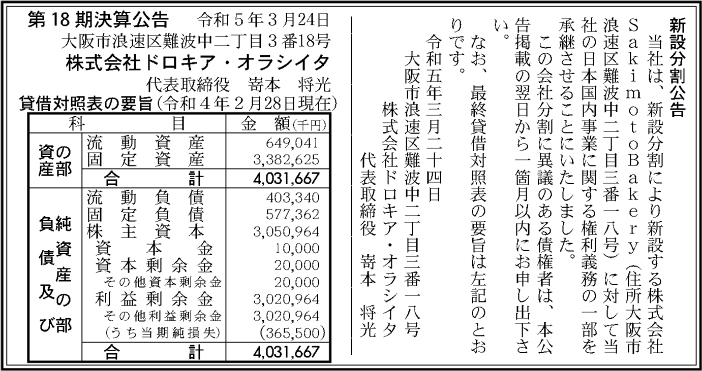 | 法人名 | 株式会社ドロキア・オラシイタ |