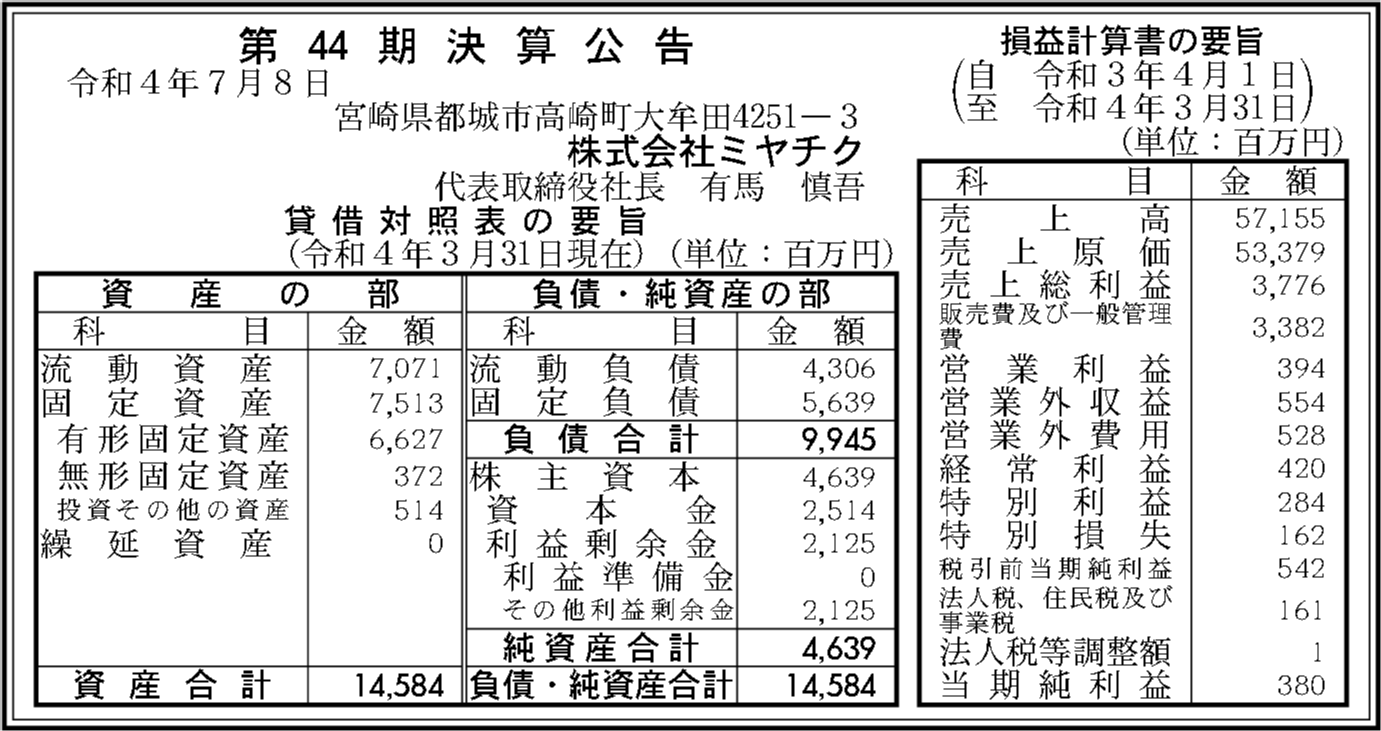 | 2022年03月31日 | 44期 | 571億5,500万円 | 3億8,000万円 | 21億2,500万円 | 145億8,400万円 |