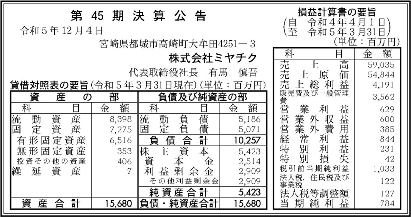 | 2023年03月31日 | 45期 | 590億3,500万円 | 7億8,400万円 | 29億900万円 | 156億8,000万円 |