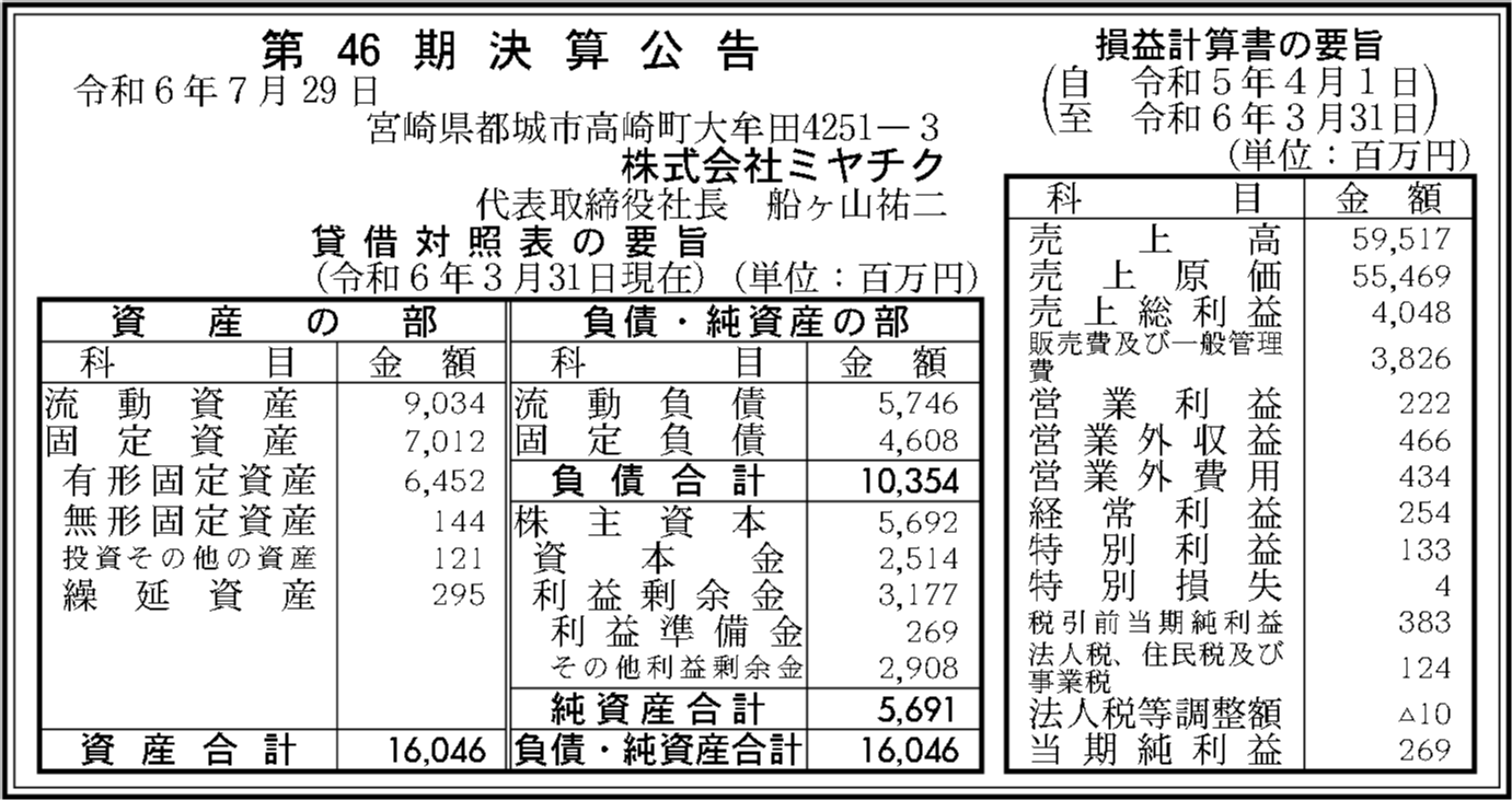 | 2024年03月31日 | 46期 | 595億1,700万円 | 2億6,900万円 | 1億7,700万円 | 160億4,600万円 |