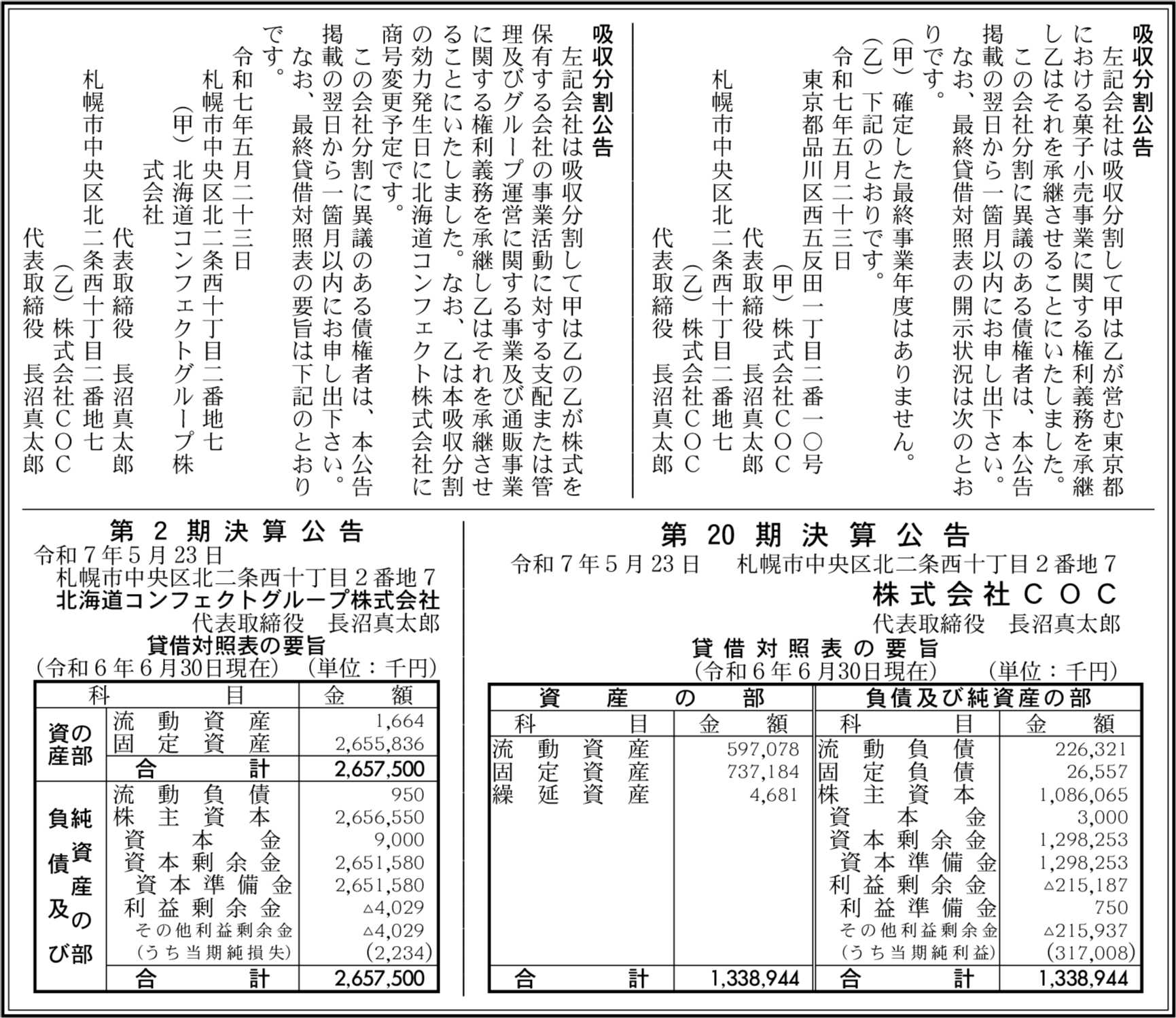 | 法人名 | 北海道コンフェクトグループ株式会社 |