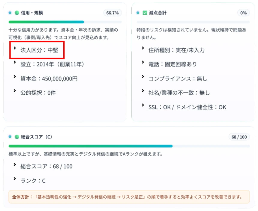 全国企業データベース(CDB)では、正確で一貫性のある企業分類を行うため、「中小企業」「中堅企業」「大企業」を独自の基準で定義しています。この分類は、中小企業基本法などの公的基準を参照しつつ、企業検索・データ分析・AI要約・業界比較など、CDBの利用目的に最適化されています。