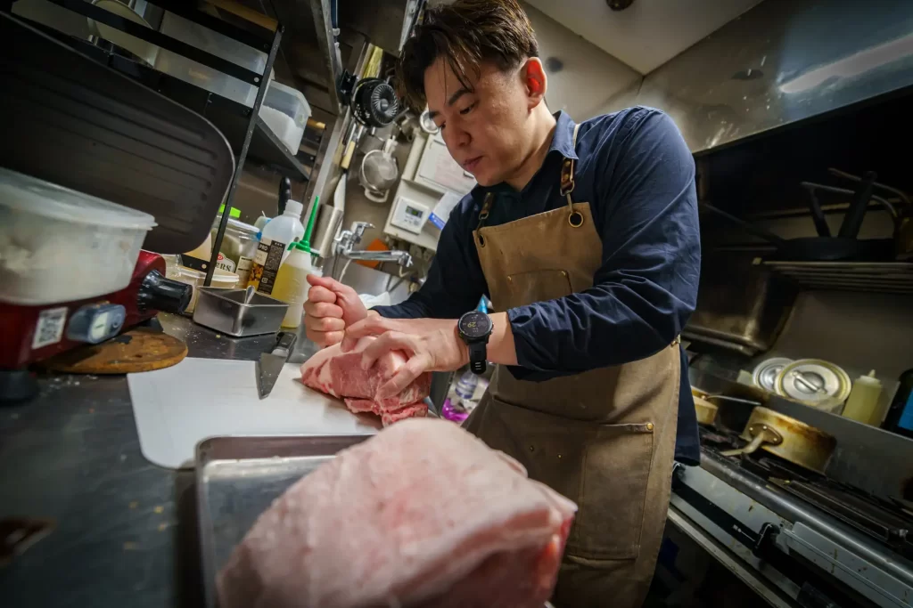 当店自慢のハンバーガーパティは、赤身の多いブラックアンガス牛を最新の熟成庫「エイジングブースター」で熟成させ、旨味を引き出しています。特製の機械で12.7mmの極粗びきに加工し、肉の旨みと食感を最大限に活かしたパティを実現しました。また、ブリスケット(バラ肉)はミックススパイスに5日間漬け込み、自家製のコーンドビーフとしてルーベンサンドに使用しています。