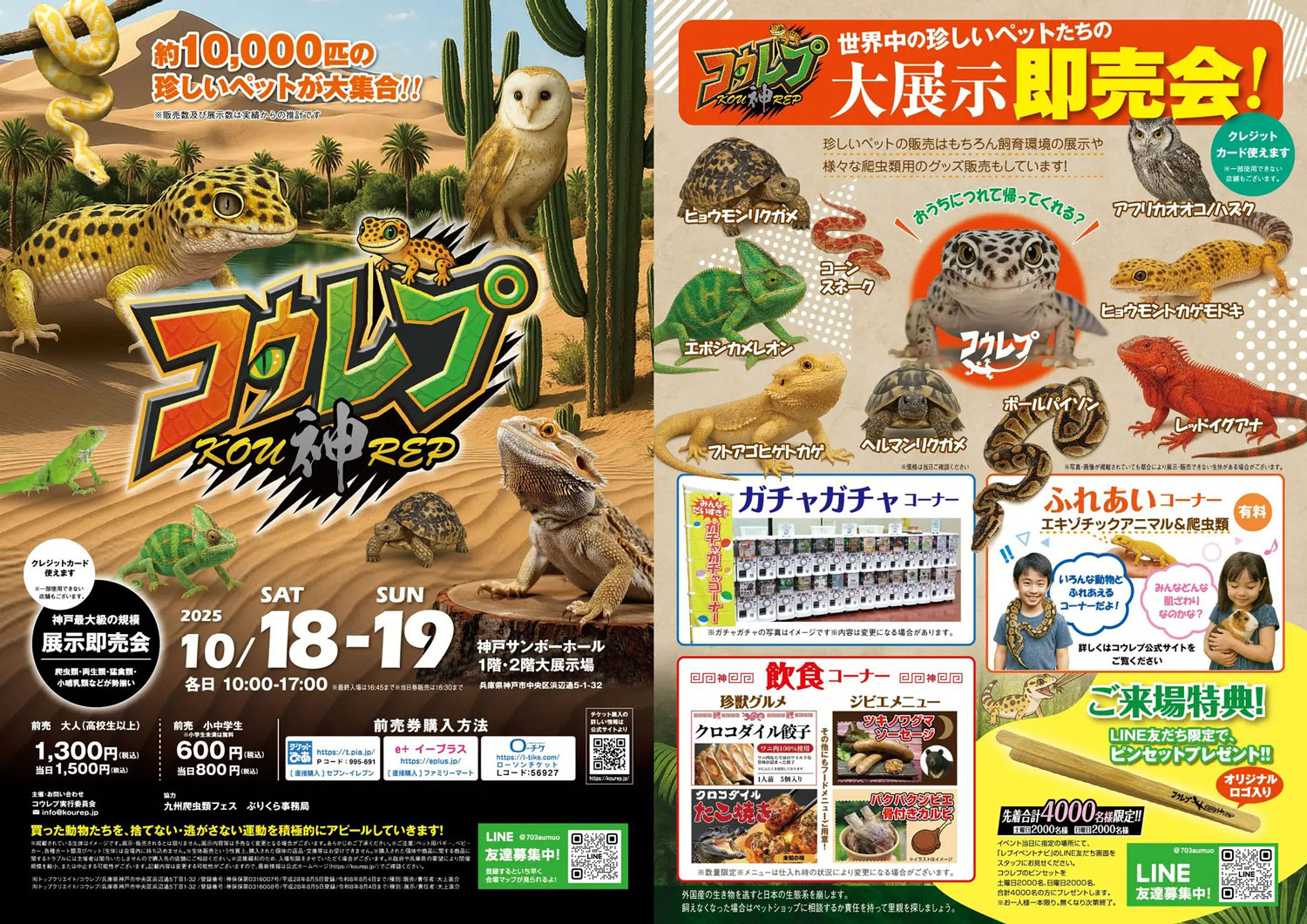 2025年10月18日(土)・19日(日)、神戸サンボーホールにて「コウレプ」開催。爬虫類やエキゾチックアニマルが大集合する展示即売会で、動物とのふれあい体験、飼育アドバイス、限定グッズ、珍獣&ジビエグルメなどコンテンツ盛りだくさん。家族連れからマニアまで楽しめる、神戸の秋を彩る特別な2日間です。