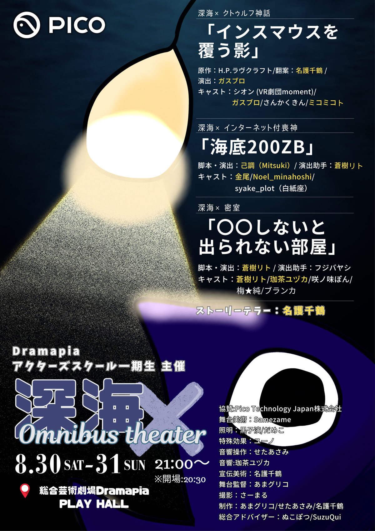 一般社団法人メタシアターが運営する「総合芸術劇場Dramapia」にて、Dramapiaアクターズスクール第1期生による卒業公演「深海✕(シンカイカケル)」が2025年8月30日(土)・31日(日)に開催されます。本公演は Pico Technology Japan株式会社の協賛公演 となり、最新のVRデバイスを活用した次世代の舞台体験をお届けします。