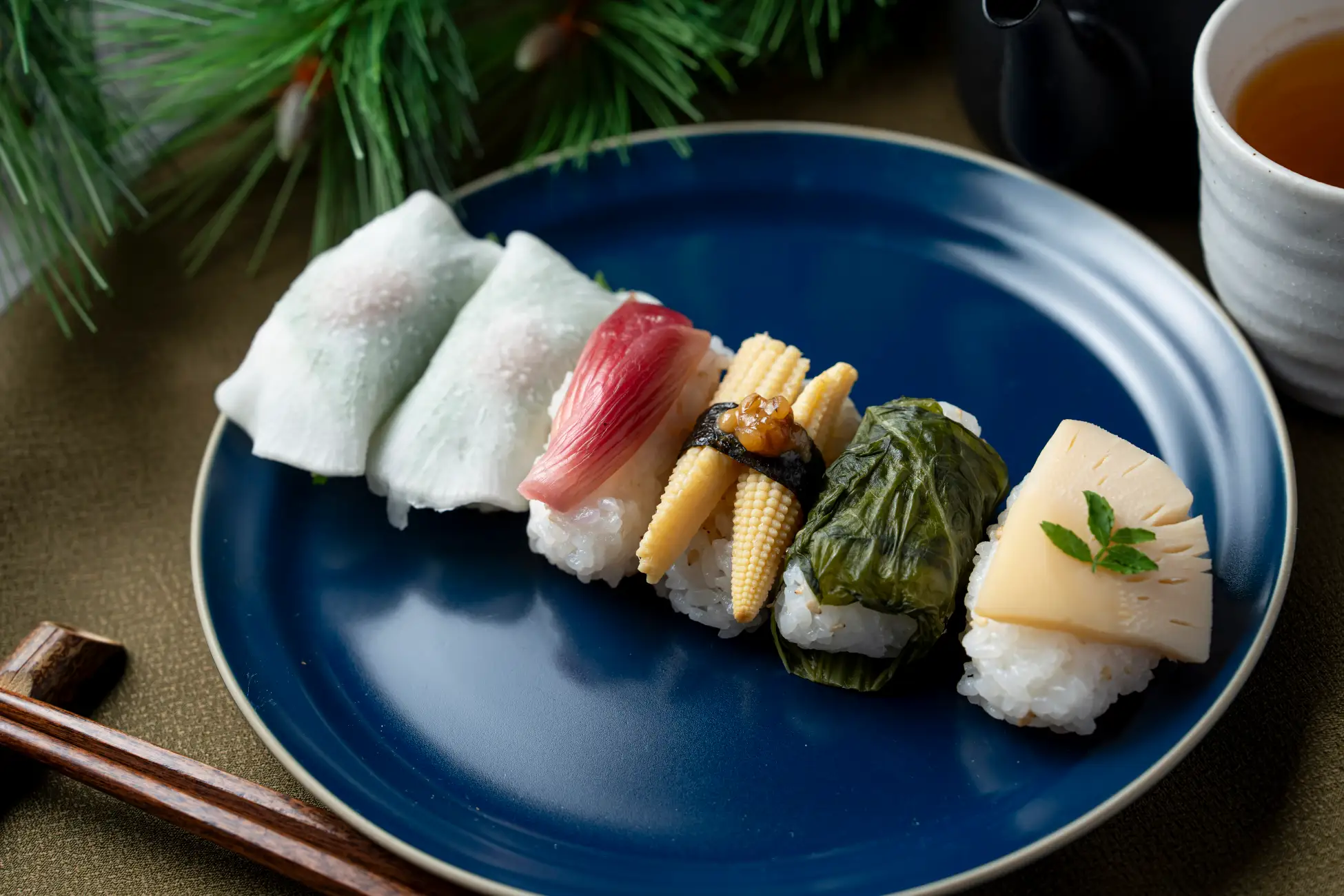 大葉大根に梅の風味を添え、めはりやみょうがの爽やかさ、ヤングコーンや筍の食感を組み合わせ、野菜本来の滋味をいかした体にも心にもやさしいお寿司に仕上げました。