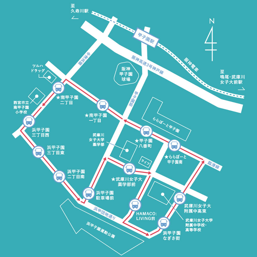 - 運行エリア:甲子園エリア(全長約5.4km・ルート/時刻表は別紙参照)