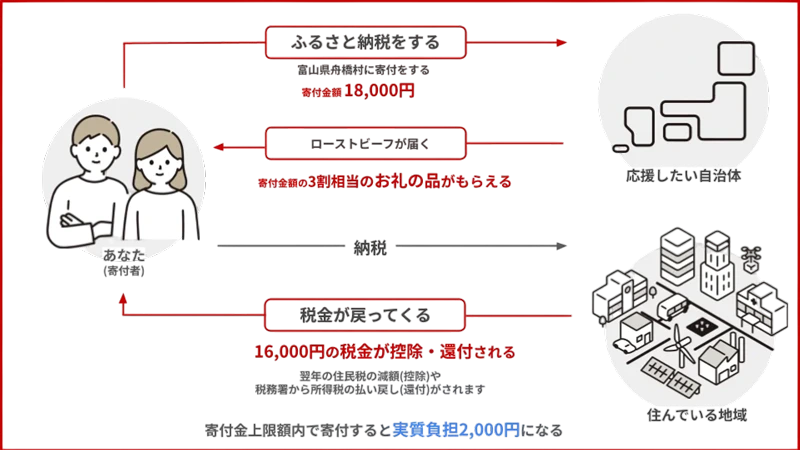 ふるさと納税をすると寄付額の約3割がお礼の品があなたに届けられます。また、一部の寄付額はあなたが選んだ寄付金額の使い道に使用されます。「寄付金額の使い道」はまちづくりや産業振興など、いくつか項目があり自治体によって決められています。寄付金のうち2,000円を超える部分については、あなたが住む地域の住民税の減額(控除)や税務署から所得税の払い戻し(還付)を受けられます。