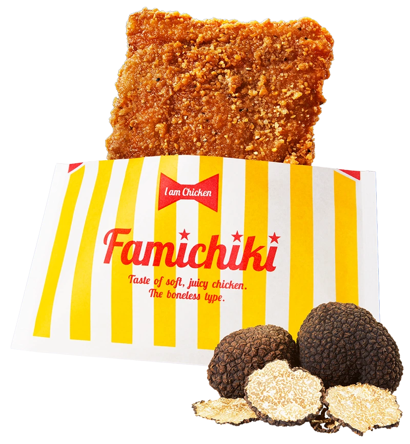 | 【内容】 | イタリア産黒トリュフパウダーを使用したファミチキです。黒トリュフの豊かな香りとチキンの旨みが絶妙にマッチした、ワンランク上の味わいです。 |
