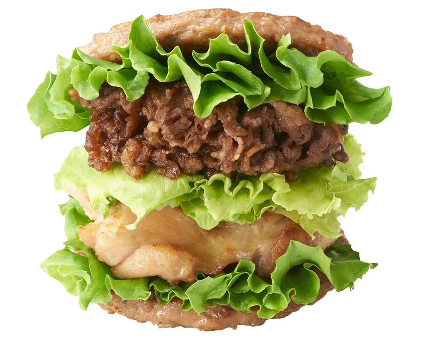 「にくにくにくバーガー」の最大の特徴は、パンもライスプレートも使用しない点にある。通常「モスライスバーガー焼肉」で使用されるライスプレート(ご飯)をパティ(お肉)に置き換えさらに、モスオリジナルの焼肉だれに漬け込んだ牛バラ肉、塩などでシンプルに下味をつけ、じっくり焼き上げた鶏もも肉(チキン)、グリーンリーフとレタスを重ね、上下をパティで挟むという大胆な構成となっている。焼肉、チキン、パティの3種の肉が一体となった、ボリューム満点かつ満足感の高い一品でありながら、糖質を抑えたい層からも支持されている点が特徴だ。