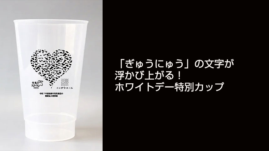 配布カップには「牛の斑点をハートに見立てたデザイン」、牛乳を注ぐと「ぎゅうにゅう」の文字が浮かび上がる仕掛けが施されており、ホワイトデーらしい遊び心のある体験を楽しめます。